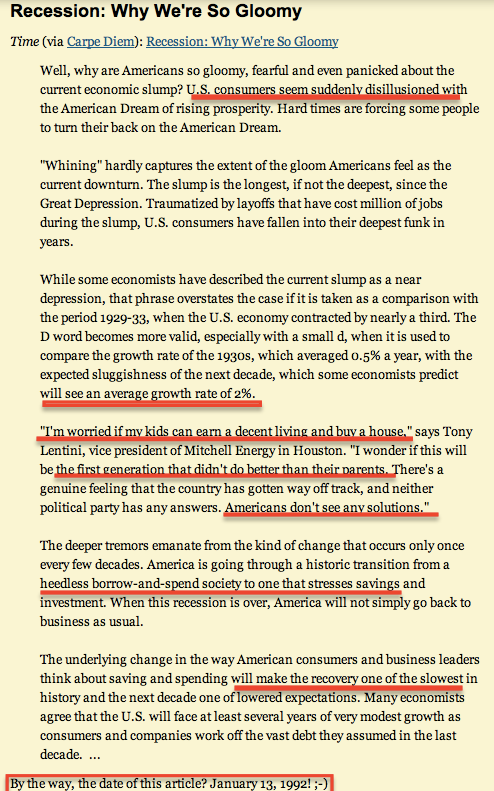 These sentiments were written in Time in 1992, the year one of the biggest growth eras in American history began. But these same words are often used to describe the current economic environment.