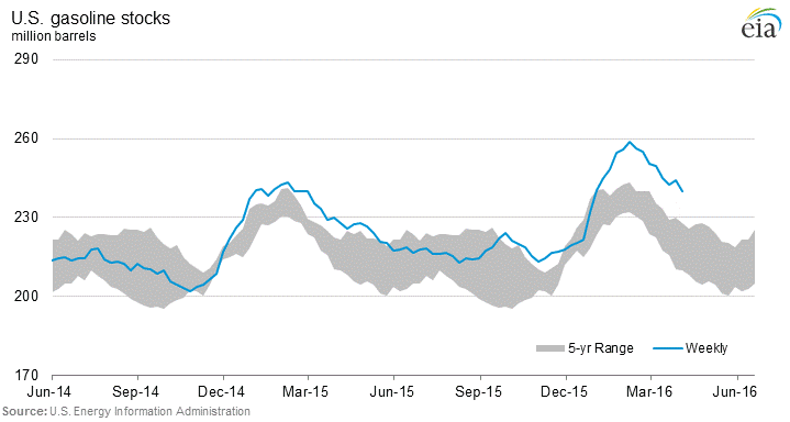 The Decline in Gasoline Stocks is reflective of the Strong Demand for Gasoline given these low prices relative to the last 10 years of historical prices. Compare Gasoline demand with this time last year, and demand is only going to strengthen into the heart of the Summer Driving Season.