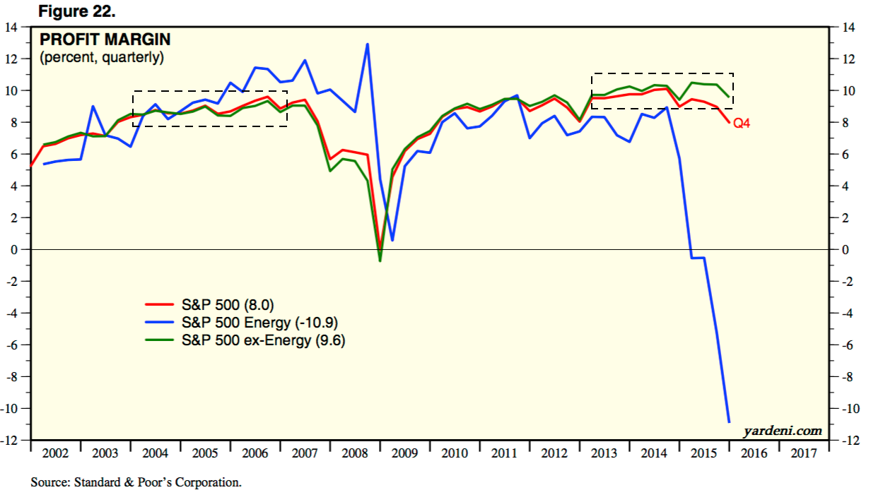 Sixth, the new ATH is coming when earnings and revenue growth are especially weak. We'll have more to say about corporate financials in a future post. For now, recognize that the heart of the 1990s bull market took place while GAAP earnings were flat (first chart, from S&P). Outside of energy, S&P margins have similarly been flat over the past 3 years (green line, second chart, from Yardeni).