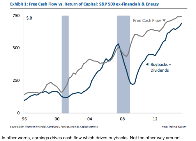 Fourth, Tuesday's ATH came during the heart of the corporate buyback blackout that lasts until companies have reported their earnings. That equities are rallying in the absence of significant buybacks makes clear that there is much more to equity appreciation than just buybacks (rising cash flow, for example; first chart from Jonathan Golub). A post on this from November 2015 is here.