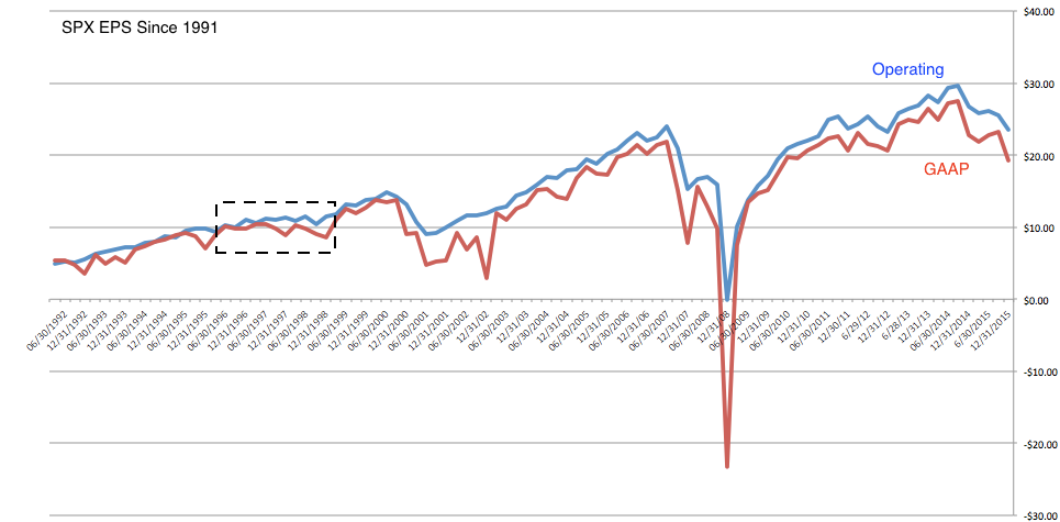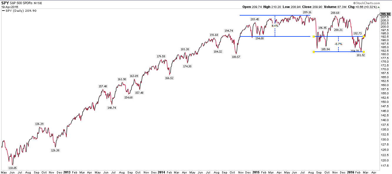First, Tuesday's ATH comes 19 months after the Fed ended it's quantitative easing program. The end of QE3 in October 2014 was widely believed to herald the start of a bear market. A post on why this was likely to be wrong from November 2014 is here. Instead of dropping to 1500 as expected by Zero Hedge (first chart), the S&P gained more than 8% over the next 9 months (second chart). Even at the February low, the S&P was nowhere near 1500.