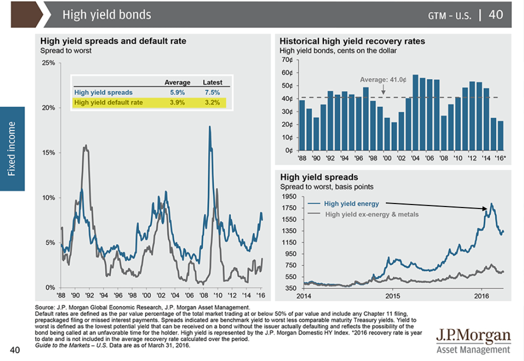 Seventh, only a few months ago, a credit crisis (and therefore a new equity bear market) was considered assured given the widening spreads in high yield. But those wider spreads existed due mostly to low energy prices; non-energy high-yield spreads were not alarming and overall defaults remained low. So, not surprisingly, high-yield spreads have recovered with the rebound in oil. The non-crisis has been averted (from JPM).