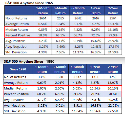 Finally, while it seems clever to list reasons for equities to plunge, the boring reality is that equities rise 70-80% of the time. The natural inclination of the equity market is to go higher over time (table from Schaeffers).