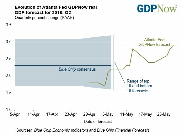 That's what the Fed has said over and over again since the minutes of the last meeting were released on 5/18. Various Fed speakers have talked about 2 or 3 rate hikes this year – if the data supports it – and now we have the Atlanta Fed providing supporting data as they have raised their GDP Now forecast by 100% this month.