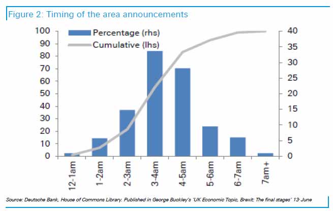 Why are we shorting? Aside from the obvious technical reason, the initial reaction is often an over-reaction and there is NO WAY that they can be certain of the vote since they haven't even begun to count yet. In fact, per this chart of the UK announcements, we won't hear the first official count until 5pm EST, as the polls don't even close until 10pm in the UK and it won't be until 5am UK (midnight EST) that 75% of the votes are counted in a close election. So, much like our Presidential elections – anyone who calls a winner this early in the day is a moron.