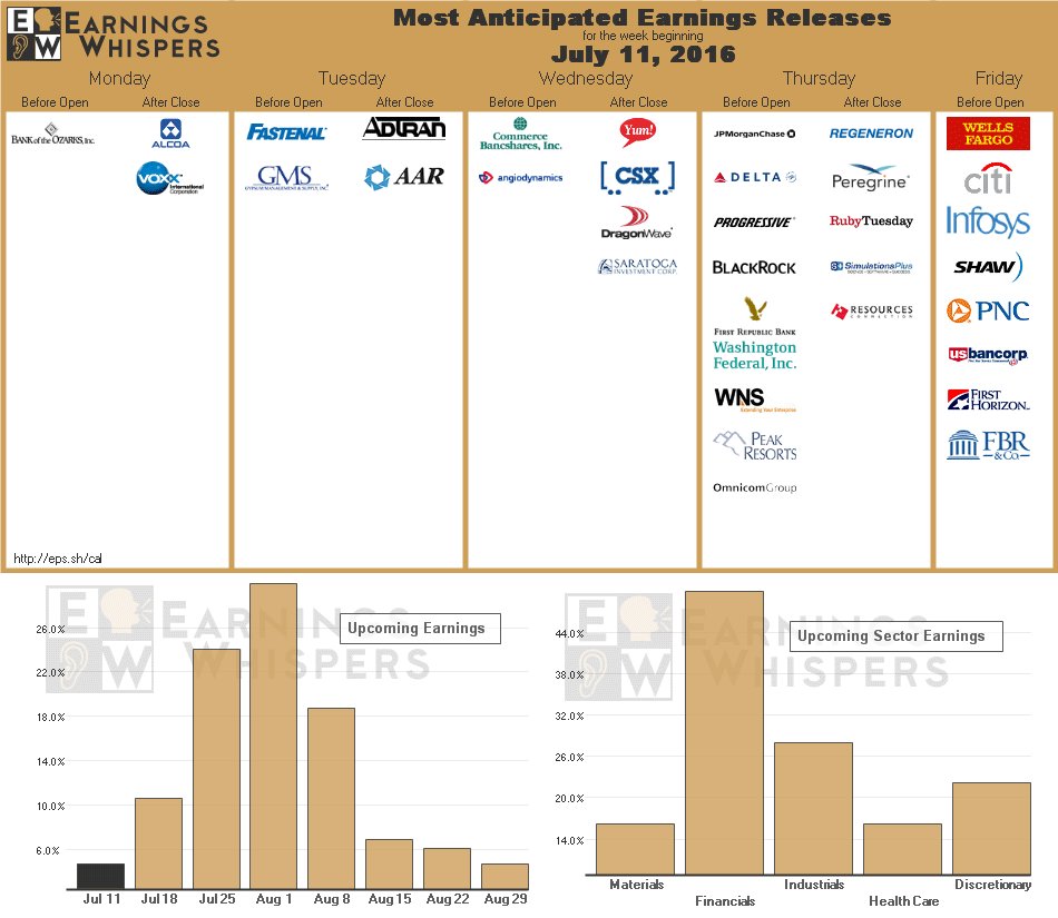 This week, we'll focus on the Financials but we'll have to be patient as the big boys don't weigh in until Thursday. Alcoa (AA) is splitting up the company so we're more interested in the conference call than the earnings report and Commerce Bank (CBSH) is one of those companies that may be ahead of themselves at $47.16 and Yum (YUM) is priced to perfection and CSX (CSX) may be too ambitious as well. It's too early to make bets, but the results will be telling.