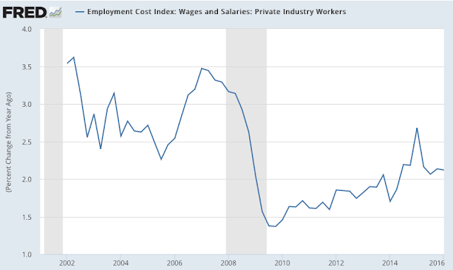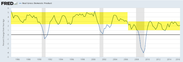 Similarly, the "real personal consumption expenditures" component of GDP (defined), the component which accounts for about 70% of GDP, grew at 2.6% yoy in 1Q16. The last seven quarters have seen the highest persistent growth rate since 2006. This is approaching the 3-5% that was common in prior expansionary periods after 1980.