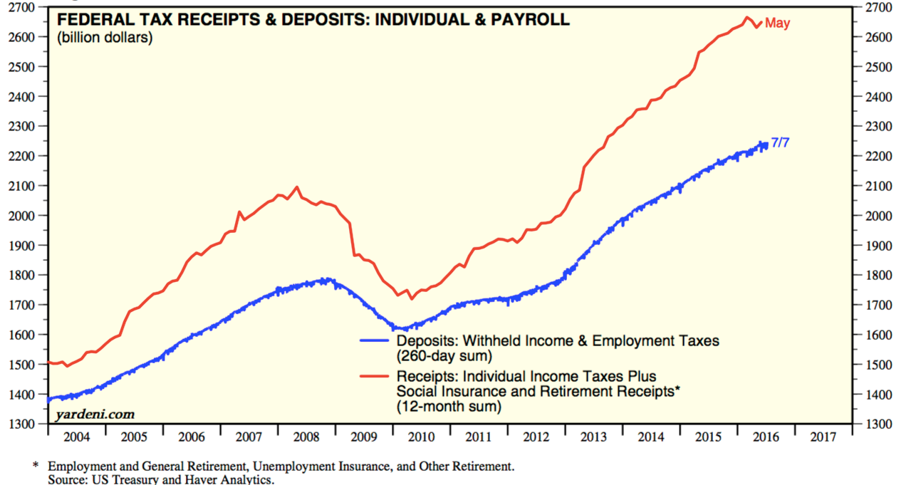 For those who doubt the accuracy of the BLS employment data, federal tax receipts are also rising (red line), a sign of better employment and wages (from Yardeni).