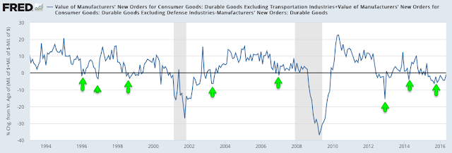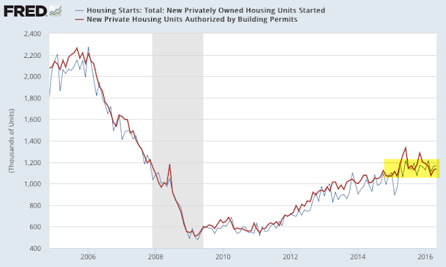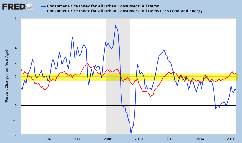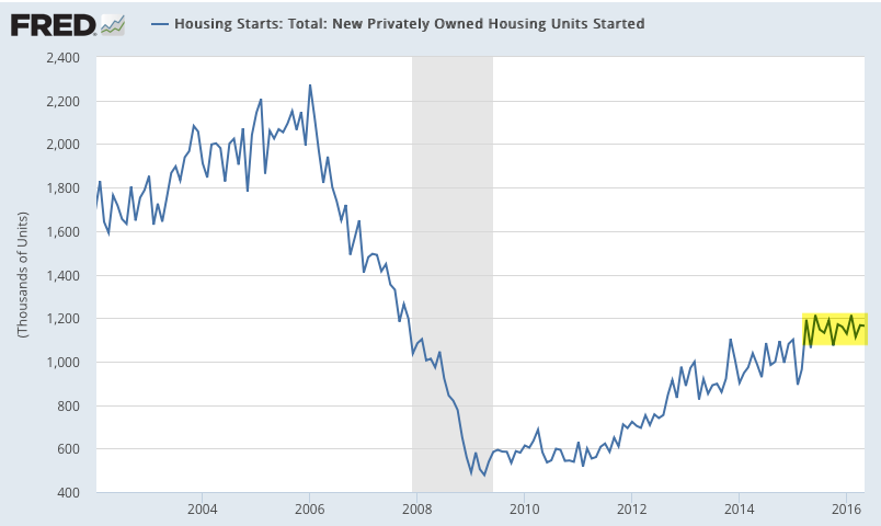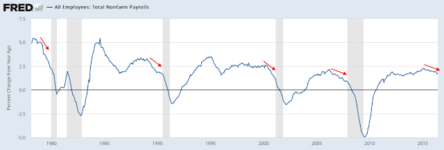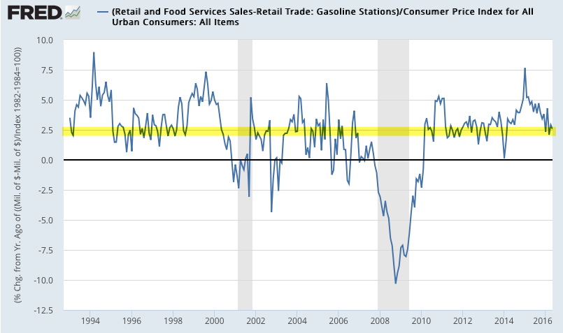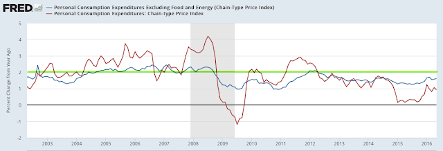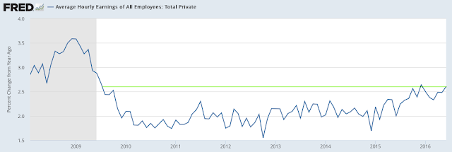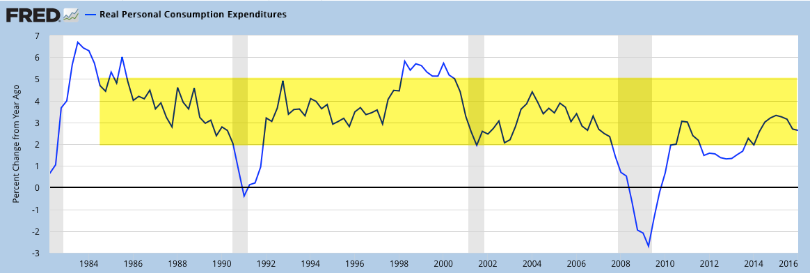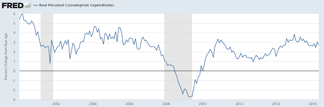 Similarly, the "real personal consumption expenditures" component of GDP (defined), the component which accounts for about 70% of GDP, grew at 2.6% yoy in 1Q16. The last seven quarters have seen the highest persistent growth rate since 2006. This is approaching the 3-5% that was common in prior expansionary periods after 1980.