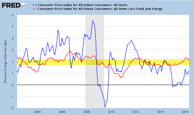 CPI (blue line) was 1.1% last month. The more important core CPI (excluding more volatile food and energy; red line) grew 2.2%, among the highest levels since 2008 but still just oscillating near 2%.