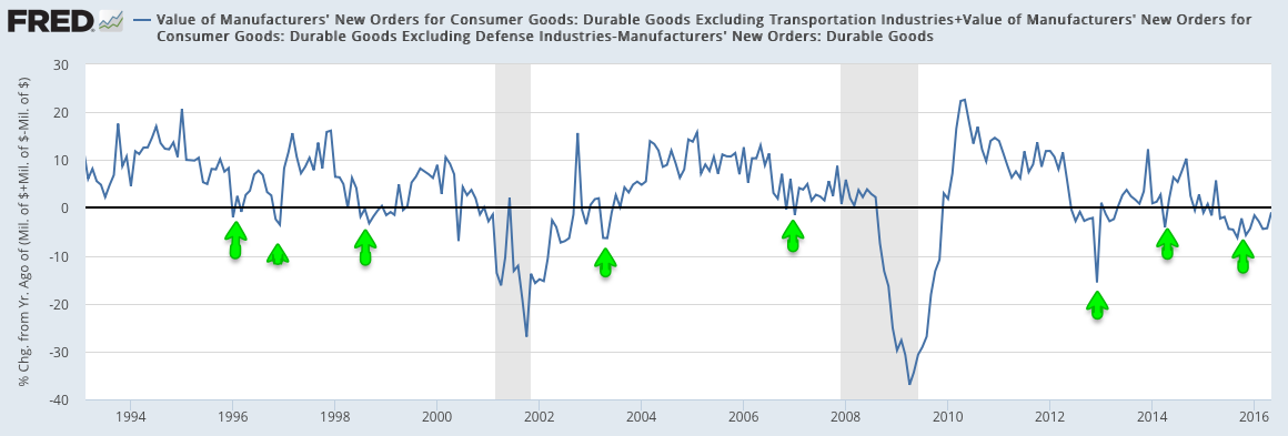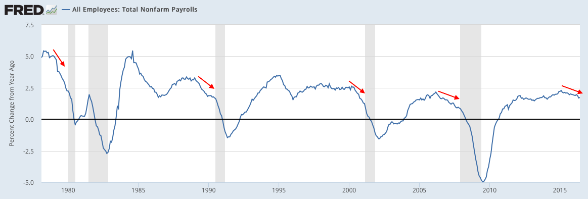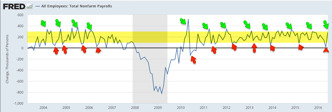 Monthly NFP prints are normally volatile. Since 2004, NFP prints near 300,000 have been followed by ones near or under 100,000. That has been a pattern during every bull market; NFP was negative in 1993, 1995, 1996 and 1997. The low print of 84,000 in March 2015 and 11,000 in May 2016 fit the historical pattern. This is normal, not unusual or unexpected.