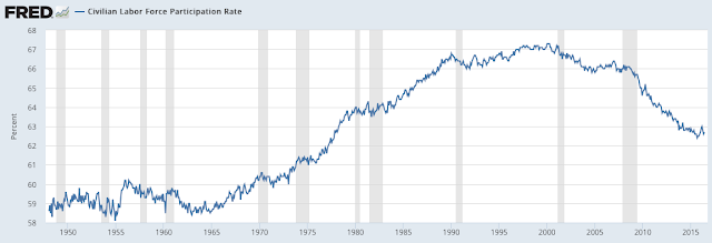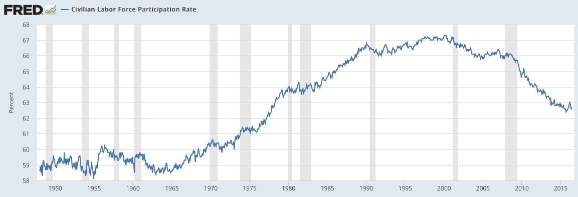 The labor force participation rate (the percentage of the population over 16 that is either working or looking for work) has been falling. This has little to do with the current recovery; the participation rate has been falling for more than 16 years. Participation is falling as baby boomers retire, exactly as participation started to rise in the mid-1960s as this group entered the workforce. Another driver is women, whose participation rate increased from about 30% in the 1950s to a peak of 60% in 1999.