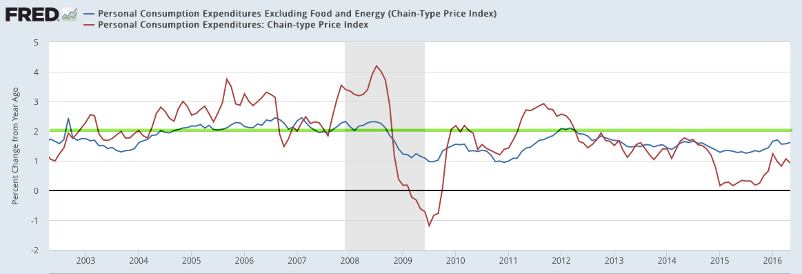 The Fed prefers to use personal consumption expenditures (PCE) to measure inflation; total and core PCE were 0.9% and 1.6% yoy, respectively, in May. Neither has been above 2% since 2Q 2012.