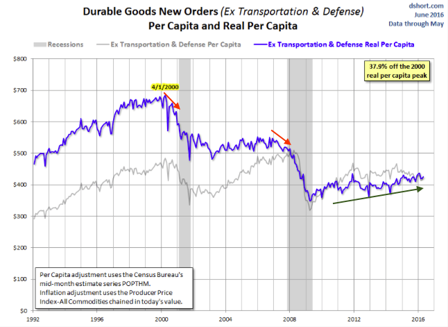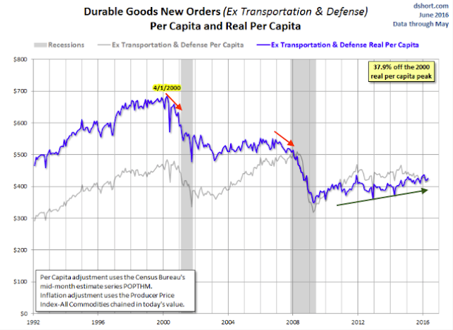 - Core durable goods growth fell -0.9% yoy in May. It was weak during the winter of 2015 and it has not rebounded since.