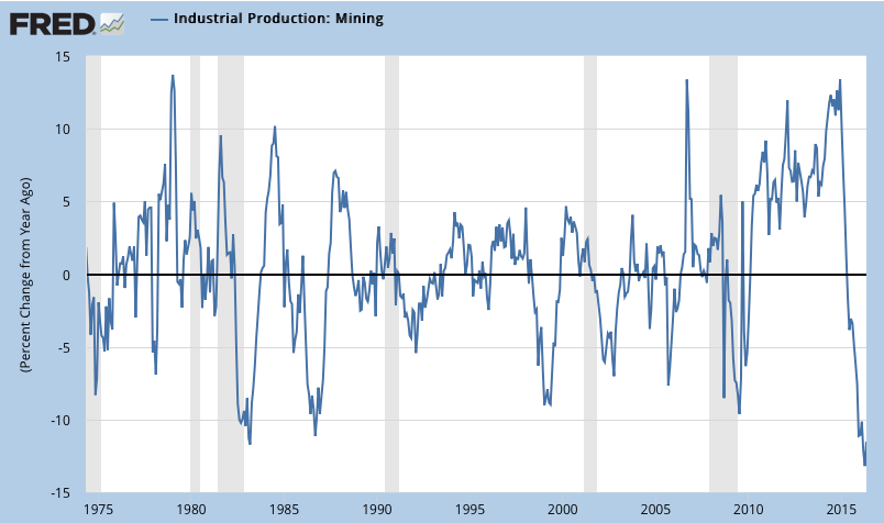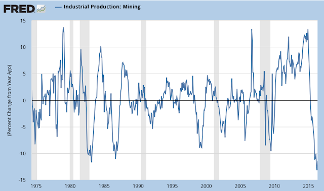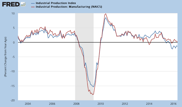 Industrial production growth was -1.4% in May. The more important manufacturing component (excluding mining and oil/gas extraction; red line) was flat at 0.0% yoy. It's a volatile series: manufacturing growth was lower at points in both 2013 and 2014 before rebounding strongly.