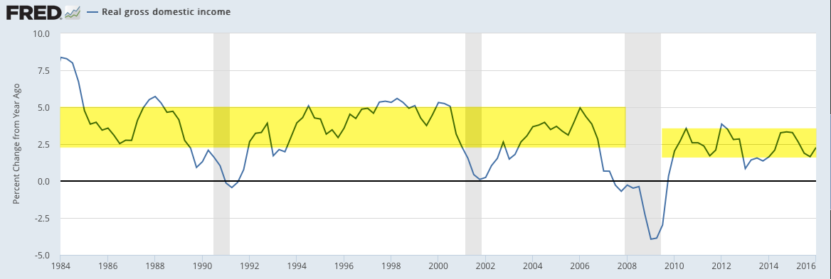 Real GDI growth in 1Q16 was 2.3% yoy (it was 3.3% in 1Q15, so the yoy comparable is unfavorable). This is in the middle of the range of prior expansionary periods since 1980 (2.5-5% yoy).