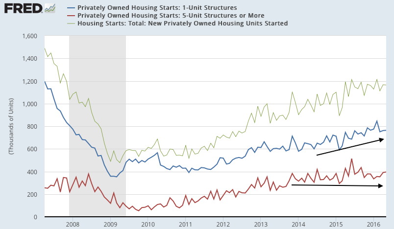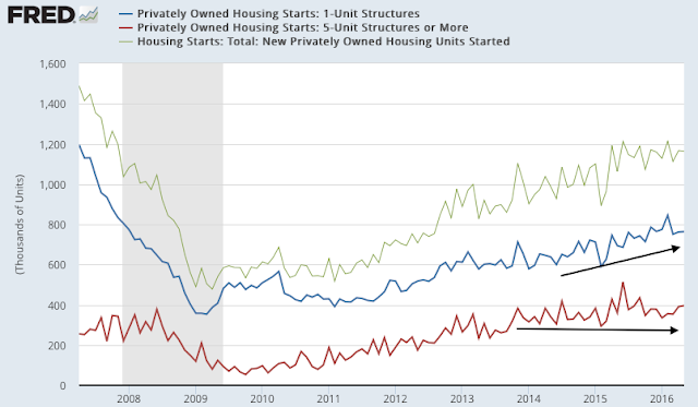Single family housing starts (blue line) were the highest since the recession in February, and only marginally lower in May. Multi-unit housing starts (red line) are flat over the past three years.
