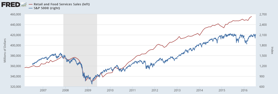 Retail sales in the past year have been strongly affected by the large fall in the price of gasoline. Retail sales at gasoline stations fell by 10% yoy. Real retail sales excluding gas stations grew 2.6% in May. Growth has been stronger in the past year than during most of 2011-14.