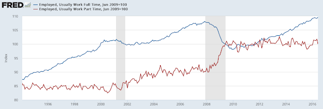 Employment has been been driven by full-time jobs, which are at a new all-time high (blue line), not part-time jobs (red line).