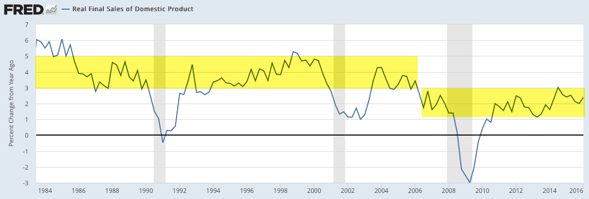 Stripping out the changes in GDP due to inventory produces "real final sales". This is a better measure of consumption growth than total GDP. In 1Q16, this grew 2.4% yoy (versus 2.4% in 1Q15). A sustained break above 2.5% would be noteworthy.