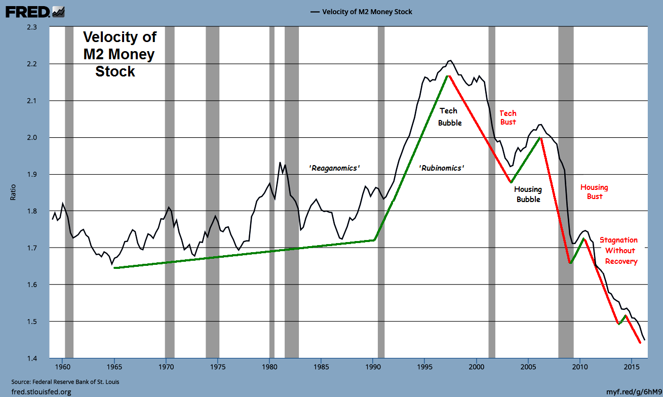 The 'recoveries' or sparks of real economic activity are growing fainter, and shorter, while the subsequent declines are continuing in length and depth. One can hardly see the 'jumps' in velocity between the long plunges driven by helicopter drops from the Fed to the one percent, leaving the real economy and the broader public further and further behind.