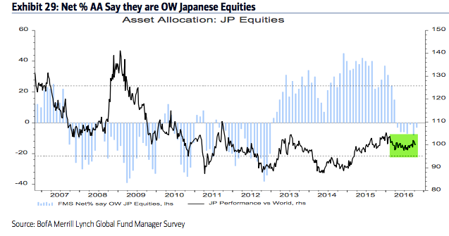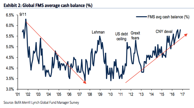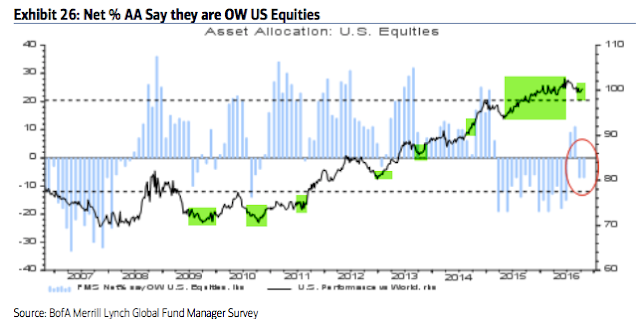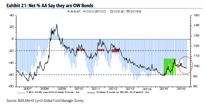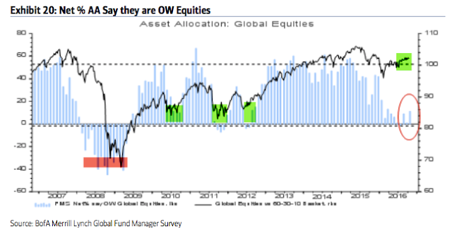 Summary: Throughout 2013, 2014 and early 2015, fund managers were heavily overweight equities and underweight cash and bonds. Those allocations have entirely flipped in 2016, with investors persistently shunning equities in exchange for holding cash.