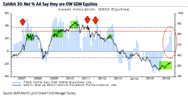 Emerging markets equities: The contrarian long in emerging markets is over. A brief recap: in January, allocations to emerging markets fell to their second lowest in the survey's history (-33% underweight), an extreme comparable only to early-2014 from which the region began to strongly outperform for the next half a year. Allocations have since risen to +31% overweight, the highest in 3.5 years. This is now 0.5 standard deviations above its long term mean. The region has outperformed the rest of the world so far 2016. There is room for exposure to increase further but allocations are now above where several prior rallies have either stalled or failed (arrows).