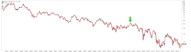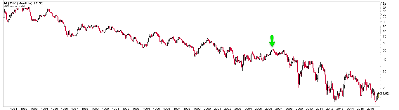 Bond allocation relative to cash are now at the lowest level since July 2006, as fund managers prefer liquidity over low yield. It's only one data point, but July 2006 was a turning point for US treasuries, from which price rose and yields fell (arrow in second chart).