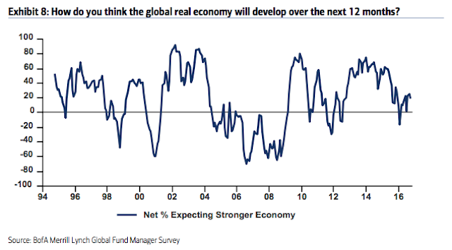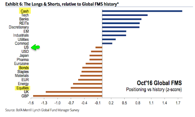 Cash: Fund managers' cash levels at the equity low in February were 5.6%. Despite the rise in global equities since then, cash levels are now higher, at 5.8%. This is equal to the high after the Brexit vote in July, higher than at any time during the 2008-09 bear market and at the highest since November 2001. Even November 2001, which wasn't a bear market low, saw equities rise nearly 10% in the following 2 months. High cash levels are supportive of further gains in equities in the month(s) ahead.