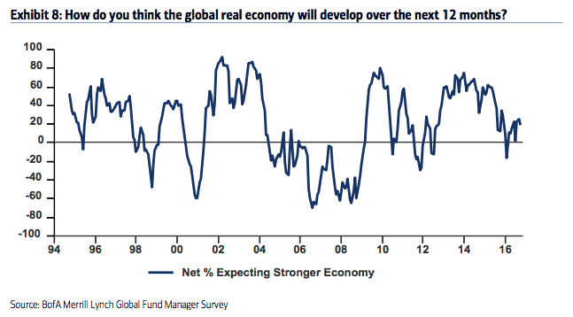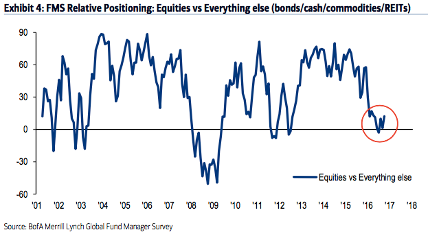 Among the various ways of measuring investor sentiment, the BAML survey of global fund managers is one of the better ones as the results reflect how managers are allocated in various asset classes. These managers oversee a combined $600b in assets.