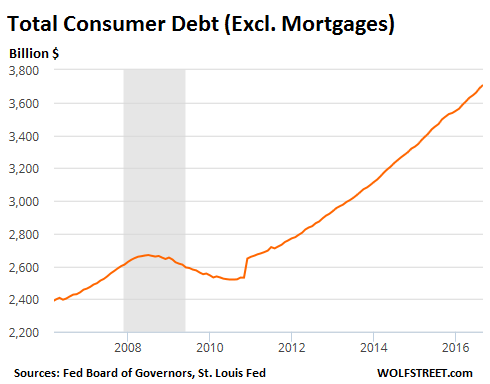 This graph from Wolf Richter shouldn’t really need any explanation, but people have been so numbed by endless repetitions of sunny skewed data that it does. Sure, mortgage debt no longer looks as bad, thanks to foreclosures, jingle mail etc. So Wolf depicts debt without mortgages.