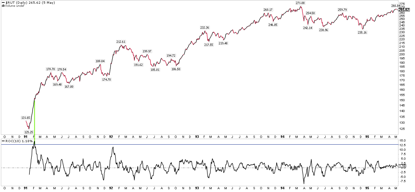 1991 was a bear market low and the strong gains in RUT initiated a fresh bull market during which the index tripled.