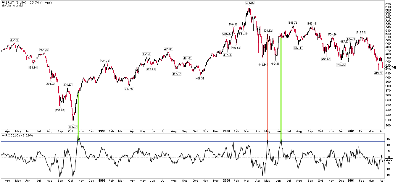 The next bear market started in 2000. After falling 25%, RUT shot up 13% May 2000. That was a false bottom (red line in the chart above). In June, the index shot up again and continued another 6% higher until September; that month, the bottom fell out of the Nasdaq, sending all the indices lower with RUT losing 40% in the next 2 years (second green line).