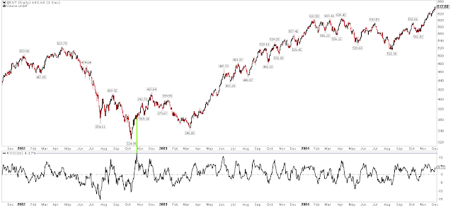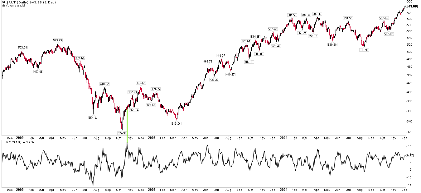 The subsequent bear market low, in October 2002, was also marked by a strong kickoff rally in RUT and the initiation of a new bull market, during which RUT eventually gained 140%.