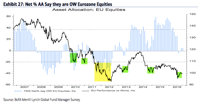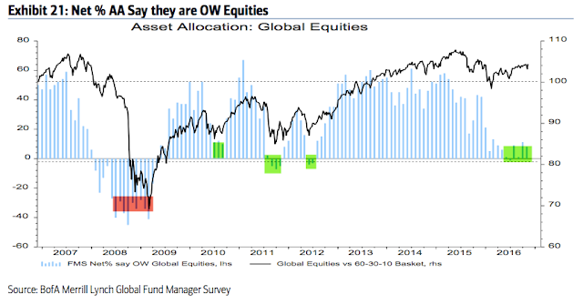 Summary: Throughout 2013, 2014 and early 2015, fund managers were heavily overweight equities and underweight cash and bonds. Those allocations entirely flipped in 2016, with investors persistently shunning equities in exchange for holding cash.