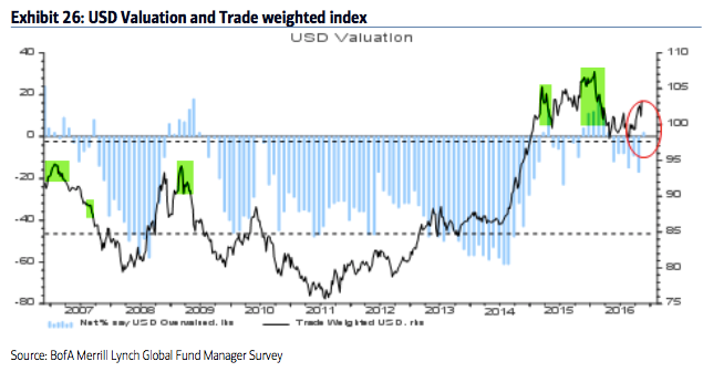 Dollar: Since 2006, fund managers surveyed by BAML have been very good at determining when the dollar is overvalued. In March 2015, they viewed it as overvalued for the first time since 2009; the dollar index fell from 100 to 93 in the next two months. In late 2015, they again viewed the dollar as overvalued and the index lost 7%. This month, fund managers view the dollar as overvalued for the first time since April 2016, during which time the index has gained more than 7%. Under similar conditions (highlighted in green), the dollar has fallen in value in the month(s) ahead.