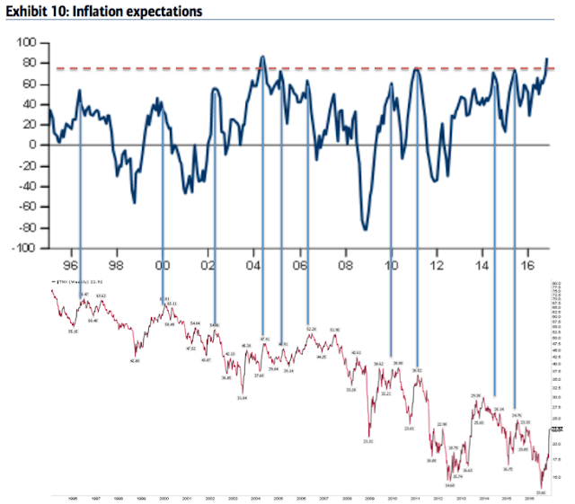Emerging markets equities: As we said last month, "the contrarian long in emerging markets is over." A brief recap: in January, allocations to emerging markets fell to their second lowest in the survey's history (-33% underweight), an extreme comparable only to early-2014 from which the region began to strongly outperform. As the region outperformed the rest of the world again in 2016, allocations rose to +31% overweight in October, the highest in 3-1/2 years. That made the region the consensus long. Emerging equities have dropped sharply in the past month. Allocations are now +4% overweight. This is 0.6 standard deviations below its long term mean. The region is no longer the consensus long and probably in the process of resetting for the next push higher.