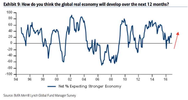 Cash: Fund managers' cash levels dropped from 5.8% in October to 5% in November. That is a big drop for one month but recall that 5.8% was the highest cash level since November 2001. Cash has remained above 5% for all of 2016, the longest stretch of elevated cash in the survey's history. Some of the wind behind the rally has faded but cash remains supportive of further gains in equities. A significant further drop in cash in the month ahead, however, would be bearish. Enlarge any image by clicking on it.