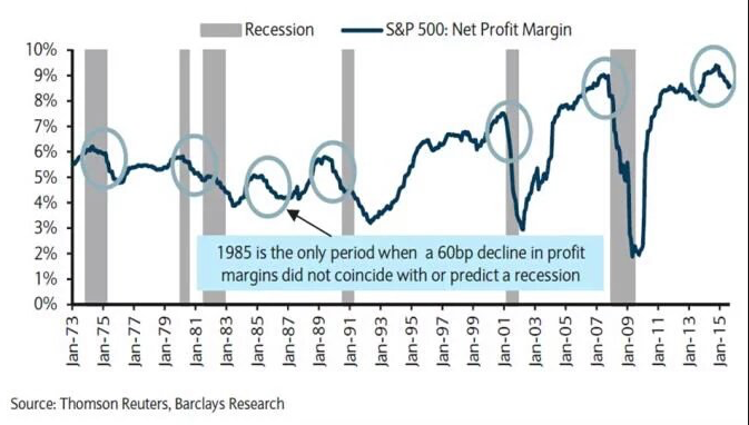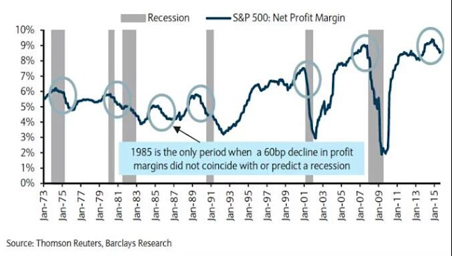The chart below was from Barclays at the start of the 2016, who said that big drops in profitability like those last year have coincided with a recession 5 of the last 6 times since 1973 (read further here). Enlarge any chart by clicking on it.