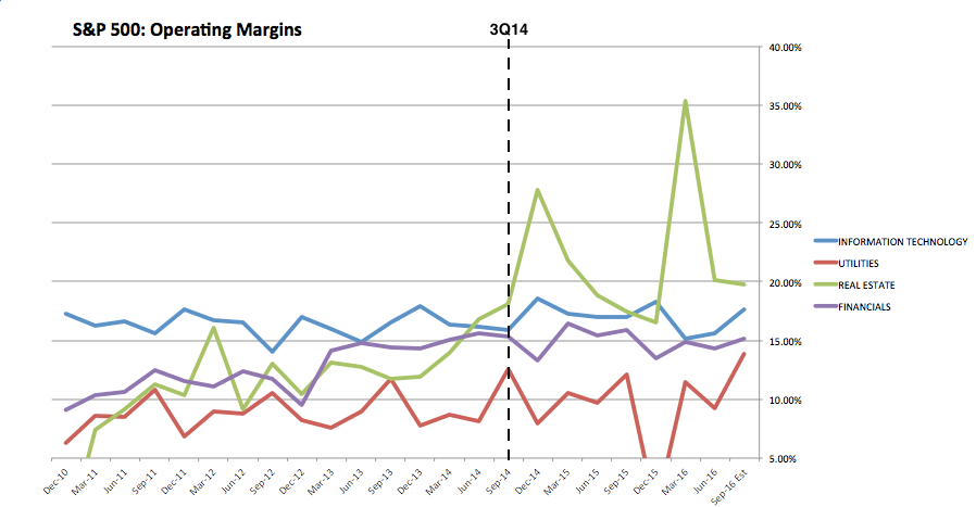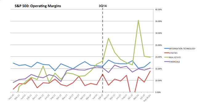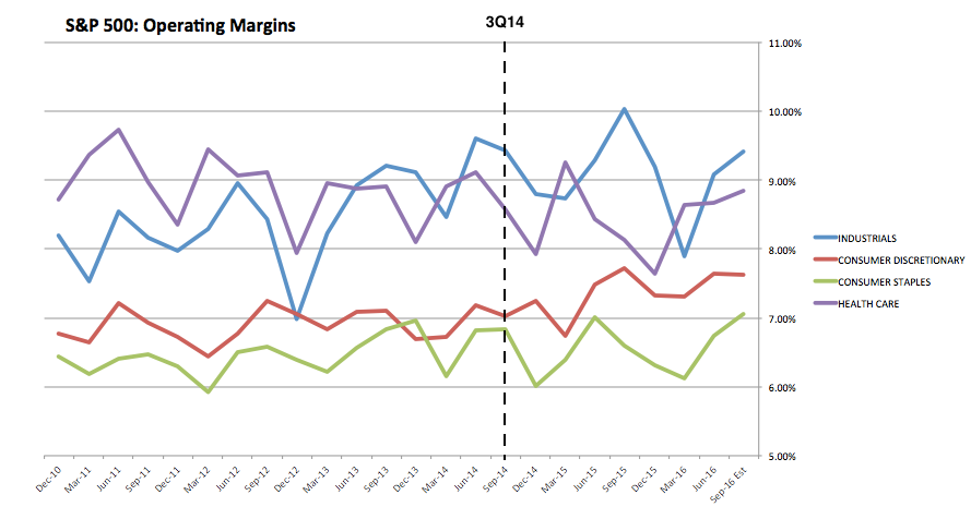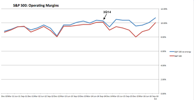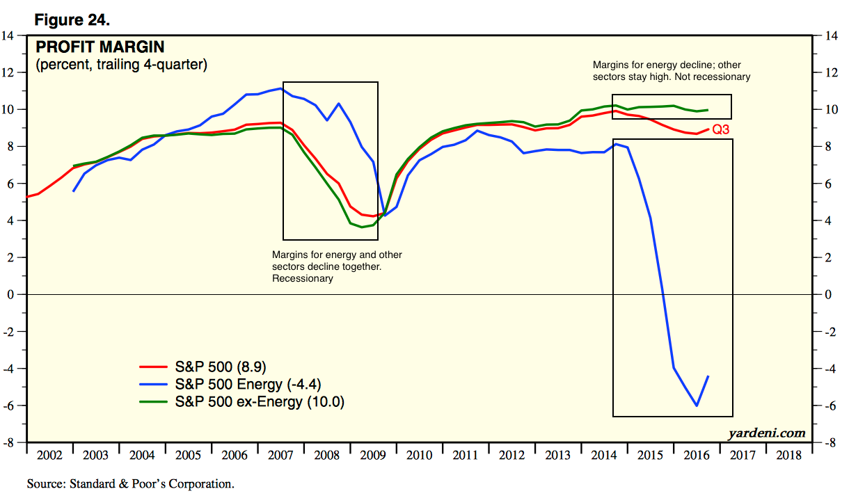 For most sectors, margins expanded between 3Q14 and 3Q16 (second column). The big outlier was energy. Energy had an outsized affect on overall margins and falsely indicated a high risk of recession.