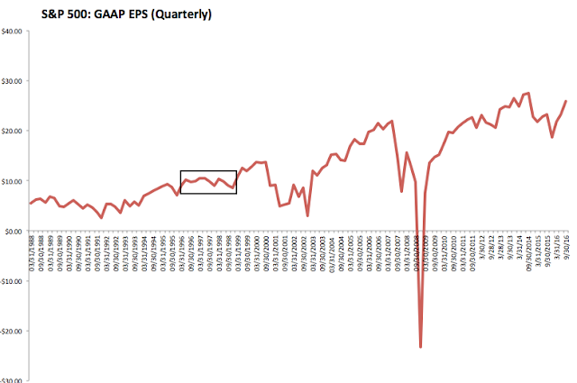 It's not well remembered now, but the heart of the 1990s bull market had a severe earnings recession that lasted for the better part of 1996-98. It dissipated after the affects of the dollar's appreciation had passed.