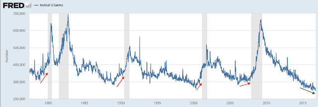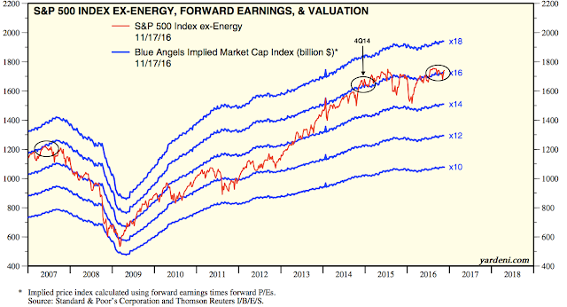 In summary, the EPS growth for the S&P was 11.5% yoy in 3Q16, the highest quarterly growth in two years. Overall profit margins are back at their former highs from 2014. Nearly all of the interim weakness in profitability was related to weakness in energy. That the other sectors showed continued strength was a very strong indication that corporate results were not indicative of an imminent recession (from Yardeni).