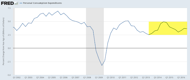 How have these dire prognoses for the US worked out? In a word: terrible. Jobless claims are at more than a 40 year low (first chart below) and retail sales are at an all-time high. US demand growth, measured a number of different ways, has been about 3-4% nominal yoy during the past two years (second chart below). There has been no marked deterioration in domestic consumption or employment.