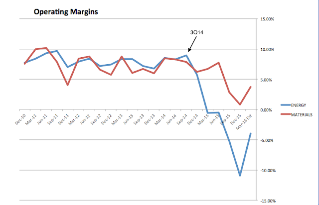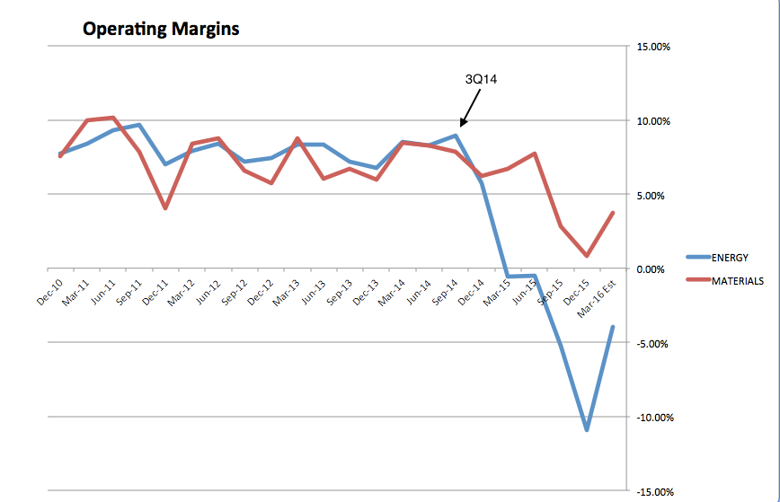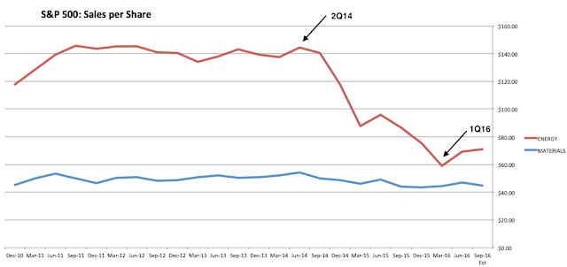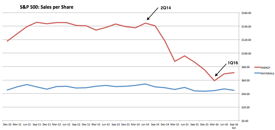 It's primarily due to oil prices, which peaked at the end of 2Q14 and then fell 70% before bottoming in February 2016. Energy sector sales fell by 60% between mid-2014 and early 2016 (red line). This has had a substantial impact on overall sales, as energy was one of the largest sectors in the S&P in mid-2014. Materials sales have also fallen, but the sector is very small.
