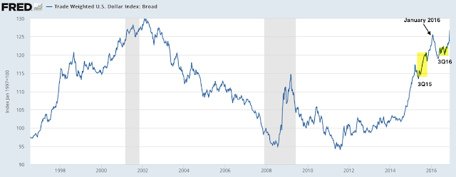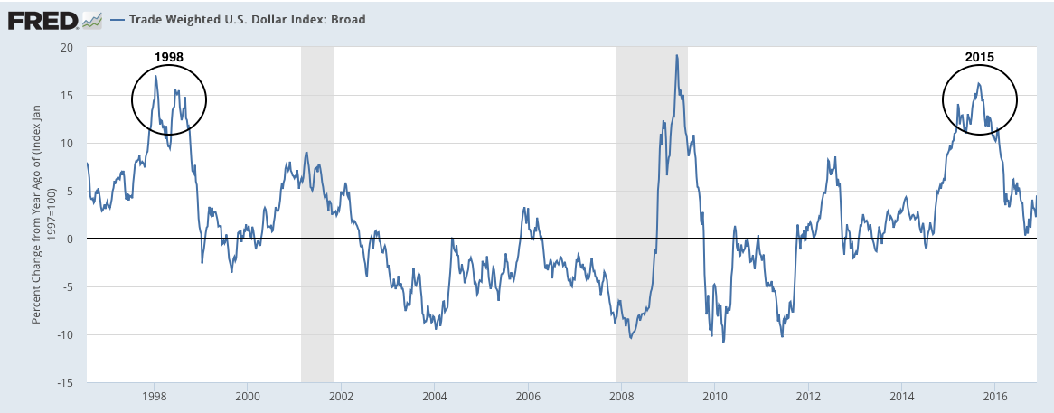 The trade-weighted dollar began to rapidly appreciate in July 2014 (3Q14) just as sales on the S&P peaked. By the beginning of 2016, the dollar had appreciated by 25%. With half of the sales of the S&P coming from outside the US, the dollar's appreciation alone cut S&P sales by more than 10 percentage points. In the chart above, you can see that a similar fall in sales growth occurred in 1998 when the dollar also rapidly appreciated over the course of a year.