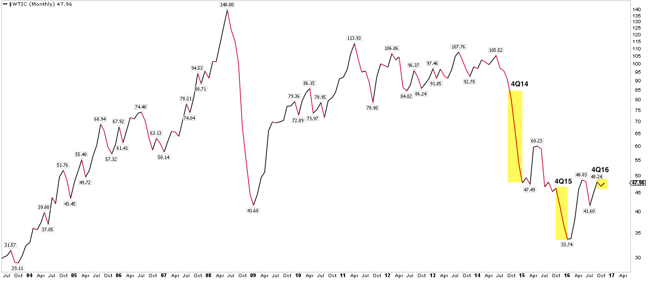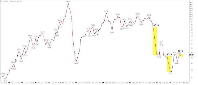 In summary, the sales growth for the S&P was 2.4% yoy in 3Q16. Energy continued to be the primary drag on overall sales growth, declining 18% in the past year. Looking ahead, the average price of oil was about $40 in 4Q15 versus the current price of $47. It's possible energy will soon contribute positively to overall sales growth.
