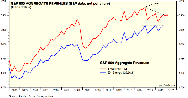 That is not to say that the combined sales outside of the energy sector are strong. Ex-energy sales growth was 5-6% in mid-2014. Over the past three quarters, growth has only been about 2%. While that's not great growth, it's also not recessionary (from Yardeni).