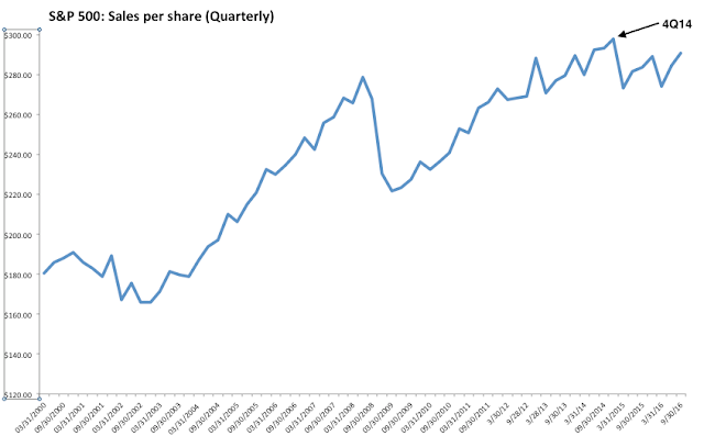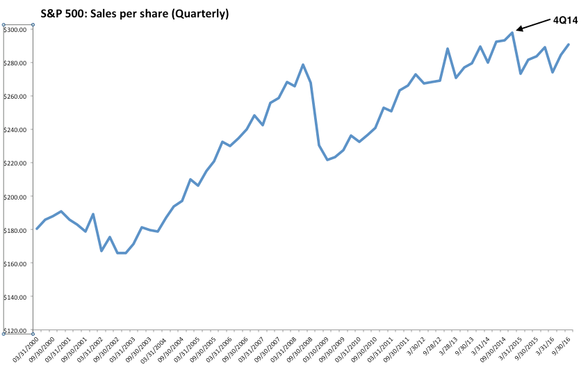 In the chart above, note that overall S&P sales are still about 2% lower than their peak in 4Q14. Why has sales growth been sluggish?