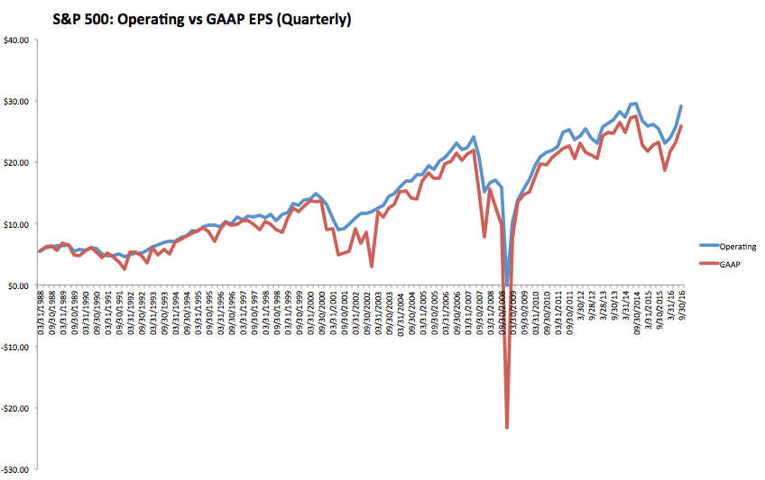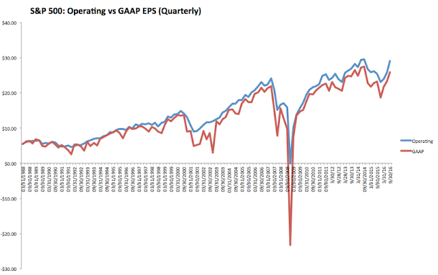The second misconception is that "operating earnings" have abnormally deviated from earnings based on GAAP in recent quarters. It is true that earnings are both overstated and smoothed on an operating basis, but that has been the case over several decades. This is not new.