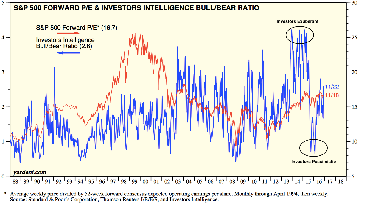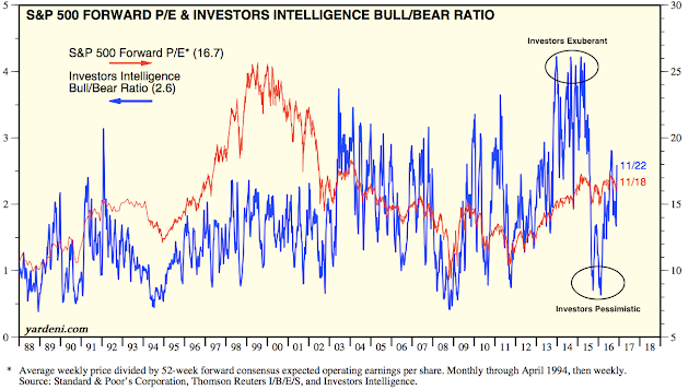 With economic growth of 3-4% (nominal), it will likely take exuberance among investors to propel S&P price appreciation at a significantly faster annual clip. Why? When investors become bullish (blue line), valuations rise (red line). Investors have most recently been pessimistic; they are now neutral. If oil prices and the dollar stabilize, earnings growth may be only 3-5% TTM yoy but valuations could push the equity market much higher (from Yardeni).